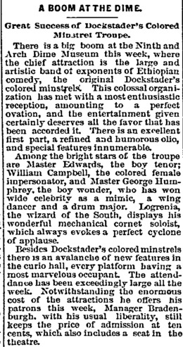 Collection: Newspaper and Periodical Clippings (Pre 1900) Institution: Digital Transgender Archive Creator: Date: 1891 Topics: Black people, Female impersonators, LGBTQ+ theater, Minstrel shows Subject: Dockstader's Colored Minstrel Troupe, Ethiopian, Ninth and Arch Dime Museum, William Campbell Description: Article in The Philadelphia Inquirer discussing Black female impersonators. -