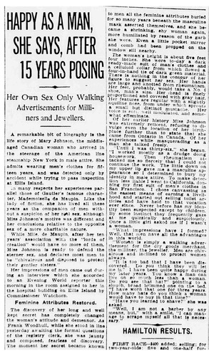 Collection: Newspaper and Periodical Clippings (1900-1949) Institution: Digital Transgender Archive Creator: Date: Oct. 5, 1908 Topics: Clothing, Crossdressing, Femininities, FtMs, Labour, Masculinities, Passing (Gender), Sexism, Stealth Subject: Frank Woodhull, Mary Johnson, Mile de Maupin Description: The Evening World (New York, NY) -