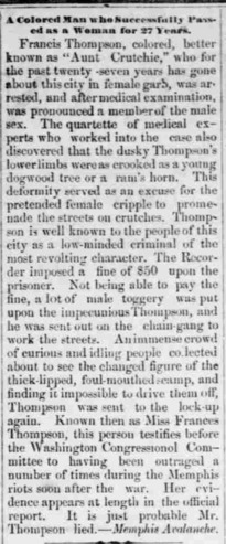 Collection: Newspaper and Periodical Clippings (Pre 1900) Institution: Digital Transgender Archive Creator: The Milan Exchange Date: Jul. 20, 1876 Topics: Arrests of LGBTQ+ people, BIPOC, Black transgender people, Memphis Race Riot, Memphis, Tenn., 1866, Outing (LGBTQ+ culture), Trans women, Transgender disabled people Subject: Frances Thompson Description: A clipping from The Milan Exchange about Frances Thompson's life, following her death in 1876.