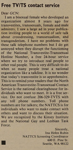 Collection: Newspaper and Periodical Clippings (1950-2000) Institution: Northeastern University Archives and Special Collections Creator: Rubin, Ina Helen Date: Jan. 31, 1988 Topics: Crossdressing, Helplines, Letters to the editor, Transgenderism, Transsexual people, Transsexualism, Transvestites Subject: American Transvestite-Transsexual Contact Service, Gay Community News, Kinsey Institute, National Gay and Lesbian Task Force (NGLTF), National Transvestite-Transsexual Hotline Number, TV-TS Contact Service Description: A response to an ad, redirecting readers from a paid trans focused talk line to a free one. Originally published on page 4 of volume 15, number 28 of Gay Community News.