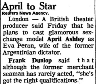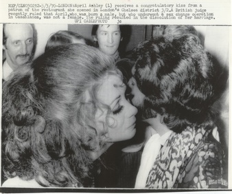 Collection: April Ashley Collection Institution: Transas City Creator: United Press International Date: Mar. 3, 1970 Topics: Actors, Entertainers, Law reports, digests, etc., Marital status, Marriage law, MtFs, Transgender people, Transsexual people Subject: April Ashley Description: At the top of photograph appears the following text: "NXP/CLN030212-3/3/70-LONDON: April Ashley (L) receives a congratulatory kiss from a patron of the restaurant she opened in London's Chelsea d... -