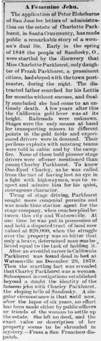 Collection: Newspaper and Periodical Clippings (Pre 1900) Institution: Digital Transgender Archive Creator: Date: May 26, 1887 Topics: Assigned gender, Death and dying, FtMs, Masculinities, Passing (Gender), Transportation occupations Subject: Charley Parkhurst, Charlotte Parkhurst, Frank Parkhurst, Peter Elehebarne Description: The McCook Tribune (McCook, Nebraska) -
