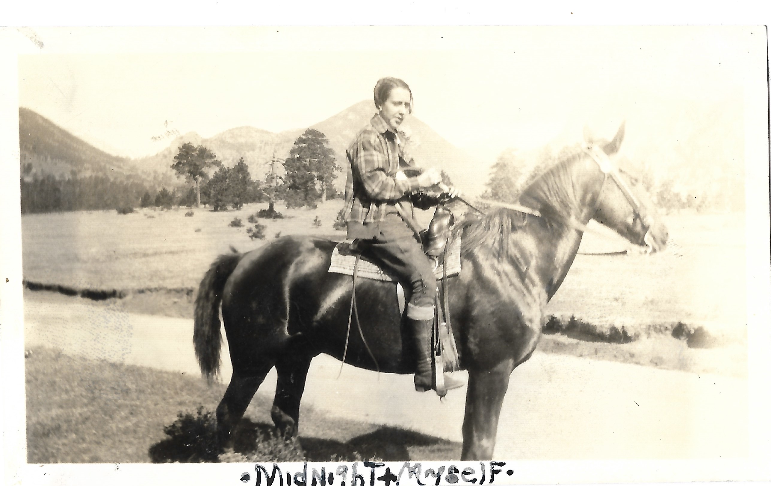 A photograph of Dorris Bullard riding a horse in a field in Colorado. The image is captioned "Midnight + Myself."