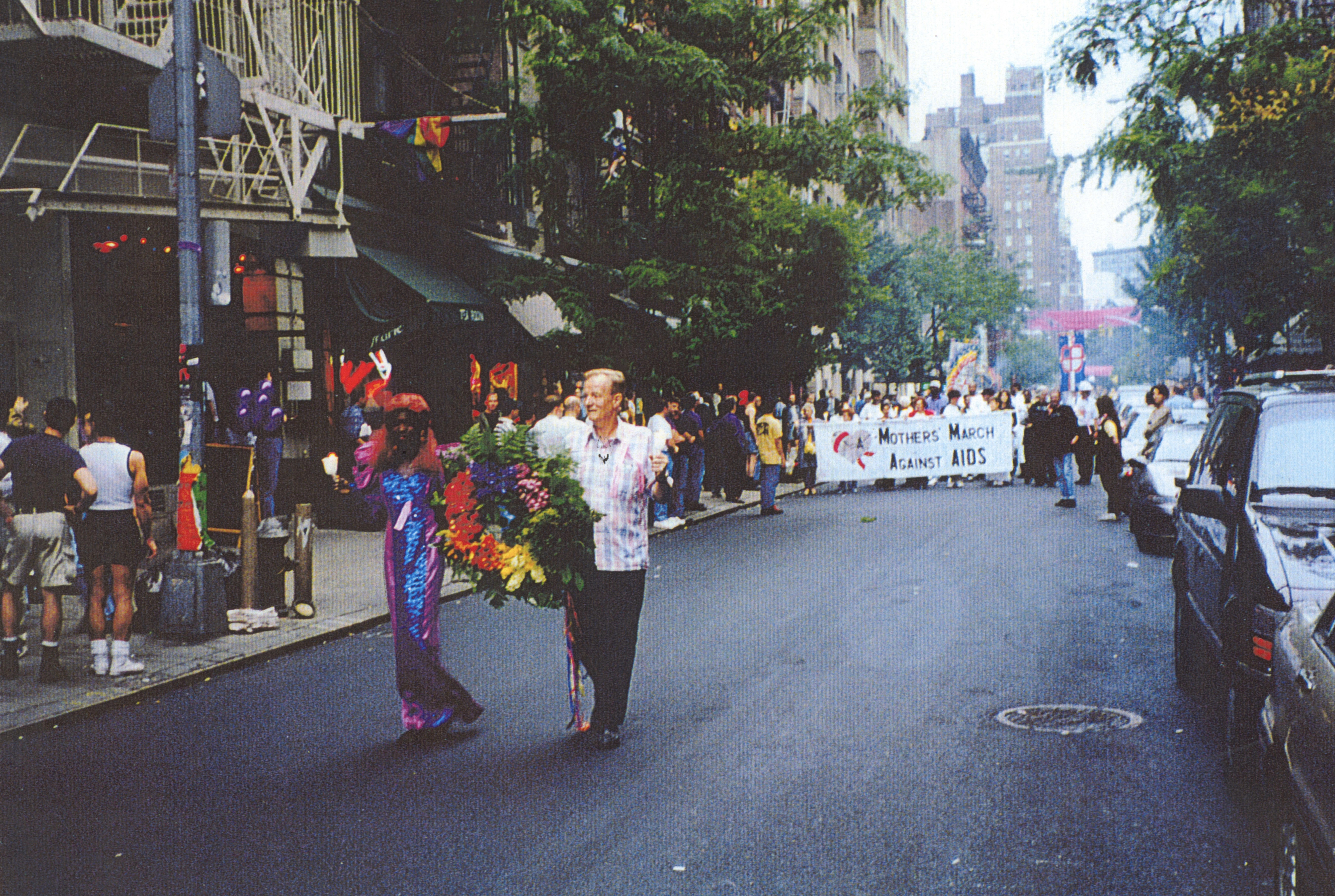 A photograph of Cocoa Rodriguez wearing a purple and blue gown and carrying a floral AIDS Vigil wreath while walking down Christopher Street in the 1995 Pride Parade with Randy Wicker. A banner that reads "Mothers' March Against AIDS" is visible behind them.