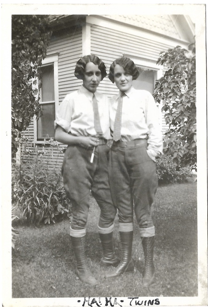 A photograph of Dorris Bullard and another person wearing matching outfits. The image is captioned "Ha Ha- Twins."