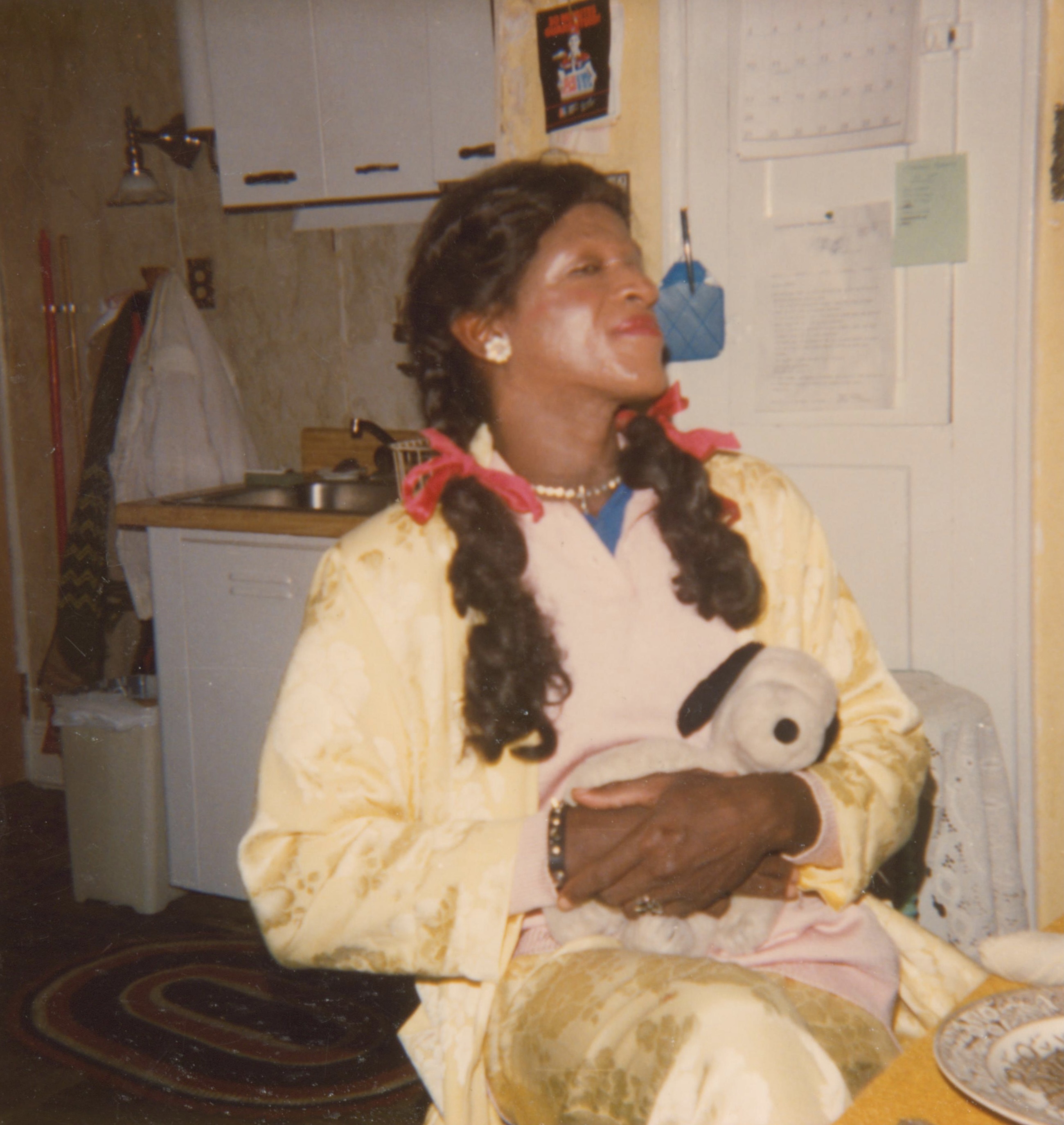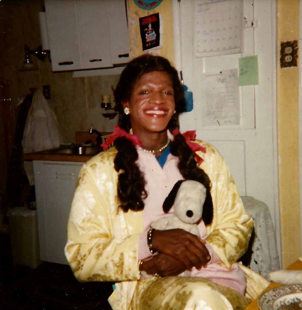 Photograph of Marsha P. Johnson wearing a pink outfit and a yellow robe over it. Marsha's hair is in pigtails tied with red ribbons. She is sitting down in an apartment while holding a Snoopy plush.