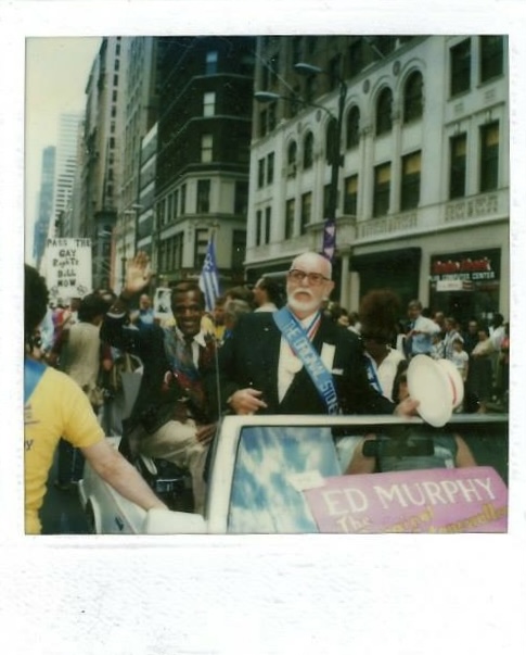 A photograph of Marsha P. Johnson waving front a car at the Christopher Street Liberation Day Parade in New York City in 1985. She’s wearing a blazer and tan pants. Ed Murphy is at the front of the car wearing glasses, a suit jacket and a blue sash. There’s also a poster in the windshield of the car with Ed Murphy’s name on it.