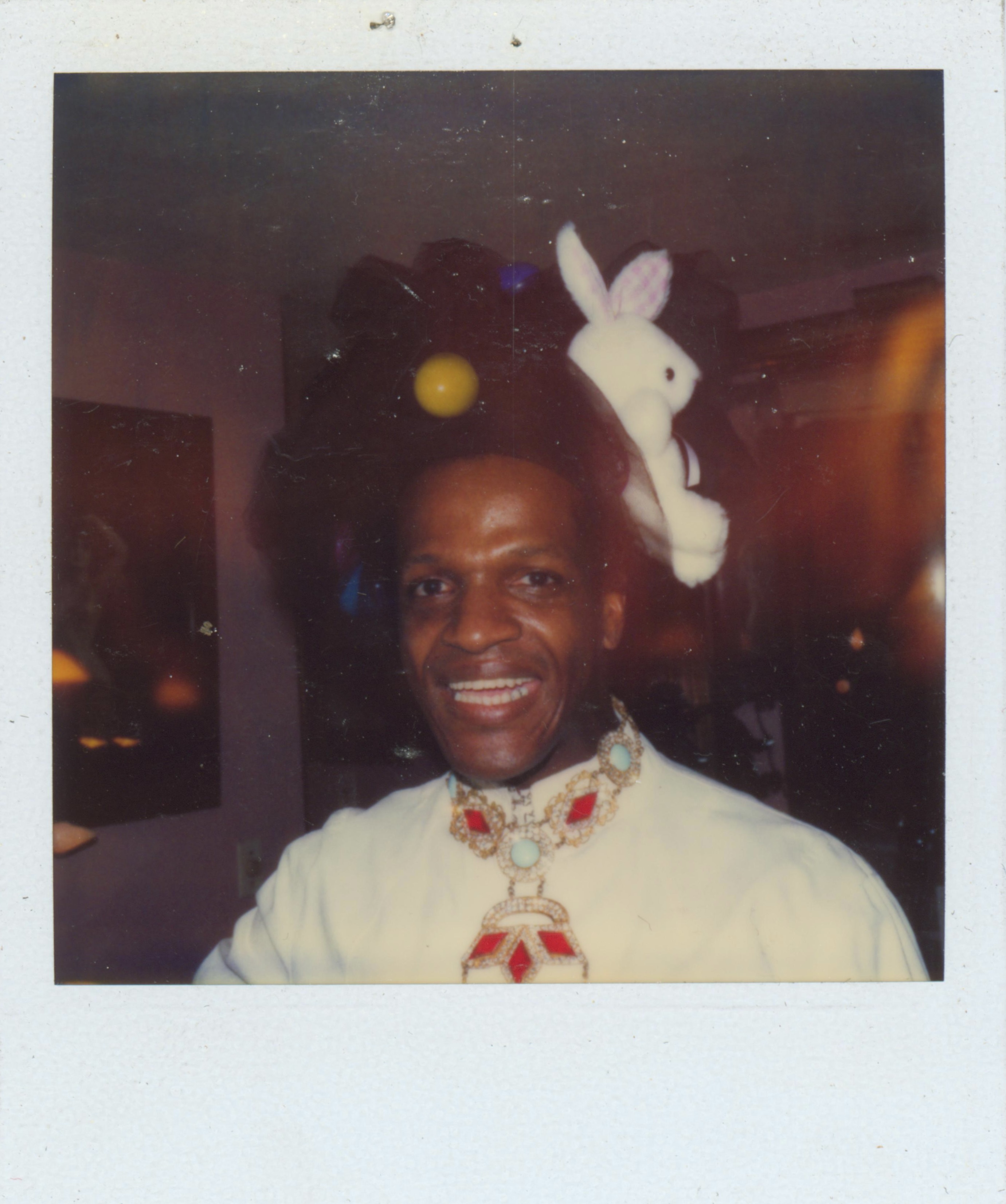 Polaroids of Marsha P. Johnson wearing a black tulle headpiece that has a stuffed bunny toy attached to it. She’s also wearing a white top and a silver necklace with red and blue gems.