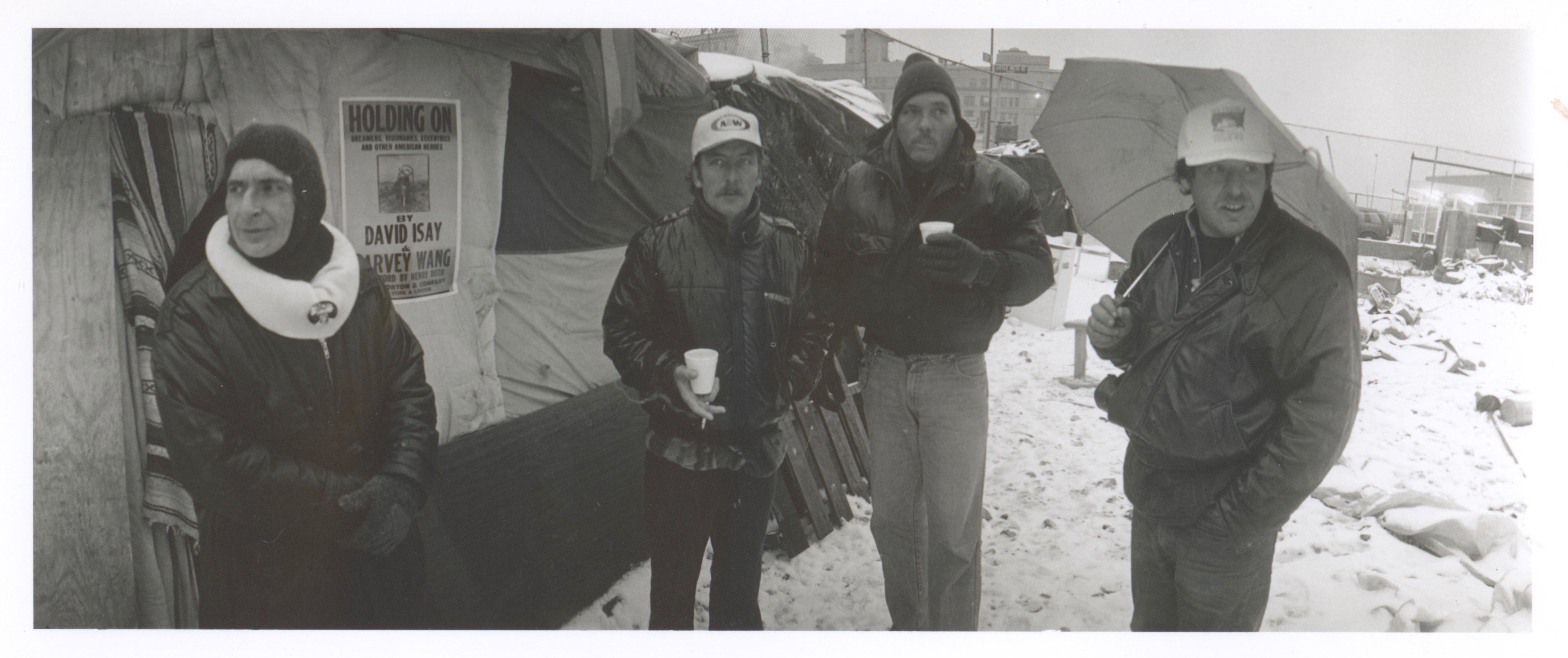 A black and white photograph of Sylvia Rivera standing with a group of unknown people along the Christopher Street piers. She's wearing winter clothing including a black jacket with a thick white collar and a black head covering.