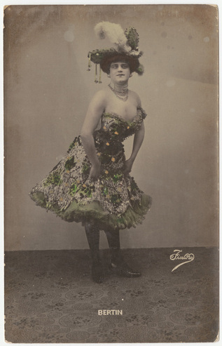 Postcards portraying cross-dressing and female and male impersonators in France, both real-photo postcards, some hand-colored, and those printed using heliogravure and offset methods. All are printed between circa 1900 and 1925 in France, except for four printed in other European countries, and all the performers appeared in France. Many images are photographs of performers on amateur, café-concert, music-hall, and legitimate stages at the high-point of cross-dressing as a form of entertainment in France. In one postcard, Jeanne Bloch is imitating Armand Fallières, President of the French Republic, 1906-1913, a provocative statement at a time when French women were still denied the right to vote. Eleven portray Robert Bertin, one of the leading female impersonators of the Belle Epoque, including images of his expert imitations of the famous singer Yvette Guilbert, who appeared in the paintings of Henri Toulouse-Lautrec, and the dancer Polaire, a lover of novelist Colette. Gerard Koskovich notes that "in the period before World War I, Bertin toured extensively, appearing not only in Paris and the provinces but also in such distant places as Buenos Aires,"and that Eloi Ouvrard, another noted music-hall performer of the era, singled out Bertin for particular praise: "Dès qu'il nous présentait une des étoiles féminines, on avait l'impression d'admirer en scène, non seulement une vraie femme mais bien une superbe et jolie femme!" Koskovich observes: "During a period when gender roles in French society moved from quite distinct to increasingly in flux, such performances were far from subversive; rather, by elaborately mimicking the dress, grooming, countenance, gestures, and forms of speech and singing attributed to the other sex, imitators reinforced normative gender expression. Comic repre-sentations of cross-dressing performed a similar function by making imperfect gender expression, notably the mixing of male and female conventions, into an object of mockery. "At the same time, at least some music-hall female impersonators—and perhaps many of them—apparently were homosexual in their off-stage lives. Given the close association of homosexuality and gender inversion during the era reflected in the collection, both the performances and their representation in postcard images may therefore have created coded spaces of sexual ambiguity for a select public that was in the know.” The second major category of postcards are gallant visual narratives of women being wooed by other women dressed as men. Included are ten hand-colored postcards in a die-cut holder, titled "Les Cerises," Paris: Kunzli Frères, circa 1900. Koskovich suggests: "The genre is no doubt related to the popularity of trouser roles in operettas and plays during the period; the celebrated actress Sarah Bernhardt, for instance, triumphed in several such roles, notably in a production of Shakespeare's Hamlet (1899) and in Edmond Rostand's L'Aiglon (1900). The link between the theatrical images and the gallant scenes is demonstrated by the music-hall and opera postcards in this collection that follow the conventions of the illustrated scenes; the only difference is that the performers are clearly identified. "Postcards of this type also may have constituted a mild and legally acceptable form of erotica calibrated for mass distribution. By portraying cross-dressed women in the sexual-aggressor role conventionally reserved for men and by tricking out the narratives almost invariably in the ancien régime trappings of the 18th-century, a period associated with liber-tine indulgence, the images likely offered inspiration for titillating fantasies of erotic role re-versal. At the same time, any hint that actual women might behave with the masculine sexual agency represented in the postcards is neutralized by the coy and stylized poses; the historical settings; and the emphasis on carefully arranged theatrical backdrops, costumes and props.” Lastly, one postcard is a reproduction of a comic drawing of a cross-dresser, and one is a comic photograph of a stout male villager dressed in the costume of a regional peasant woman. Additional postcards (cards 81-135) include gallant scenes, humorous images, popular genre narratives, and additional promotional portraits of theatrical and music-hall male and female impersonators. One postcard portrays black performers. One series titled "Chasé-croisé" (circa 1900) depicts a gallant narrative with two female and two male characters; one of the two men is played by a man, the other by a cross-dressed woman. Three postcards are images from the Idylle a Trianon" series.