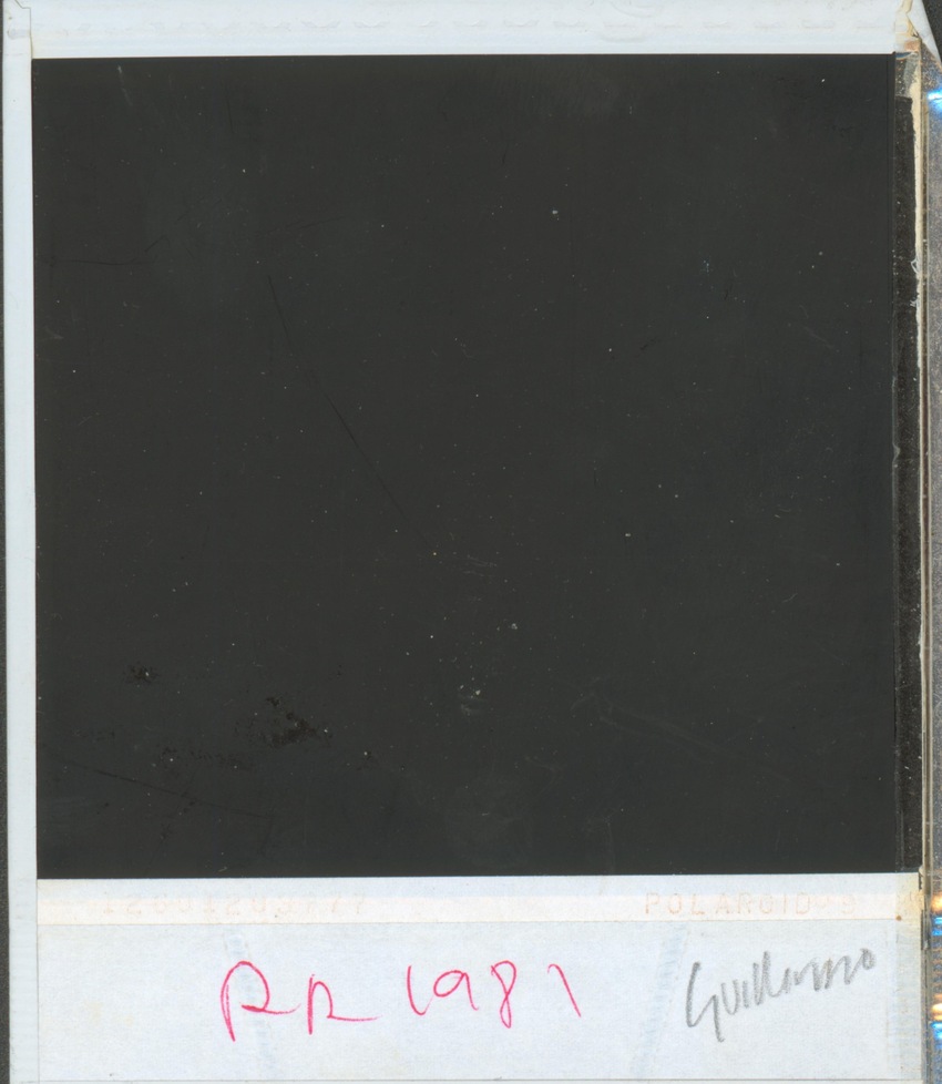 A photograph of Guillermo Knight, wearing a towel and standing by a sink holding a razer. The back of the photo reads "PR 1986."