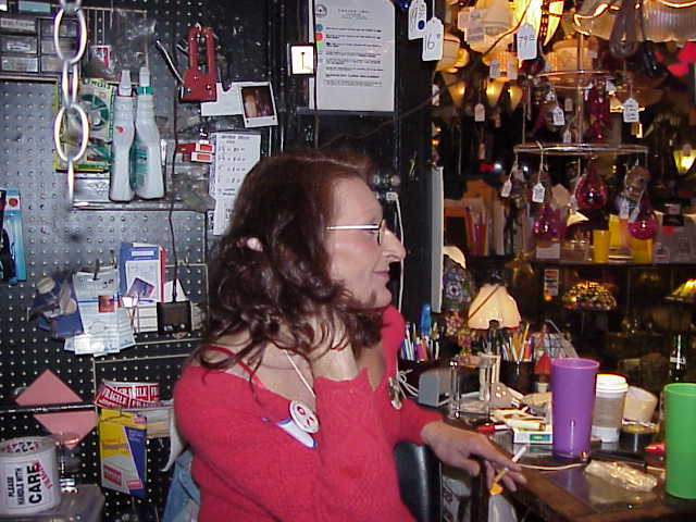 A photograph of Sylvia Rivera’s side profile while she’s sitting at Randy Wicker’s store Uplift Lighting. She’s wearing glasses and a red shirt with buttons pinned with it, and holding a cigarette between her fingers. Behind her are lamps and store supplies.