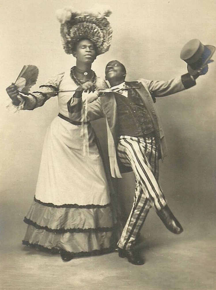 Jack Brown leans toward partner with face upturned and right arm extended holding a fan. Gregory leans back toward Brown with his cane and top hat held high. Brown and Gregory performed the Cake-Walk, a very popular dance, as part of “Les Joyeux Nègres"at the Nouveau Cirque in Paris from 1902-1903.