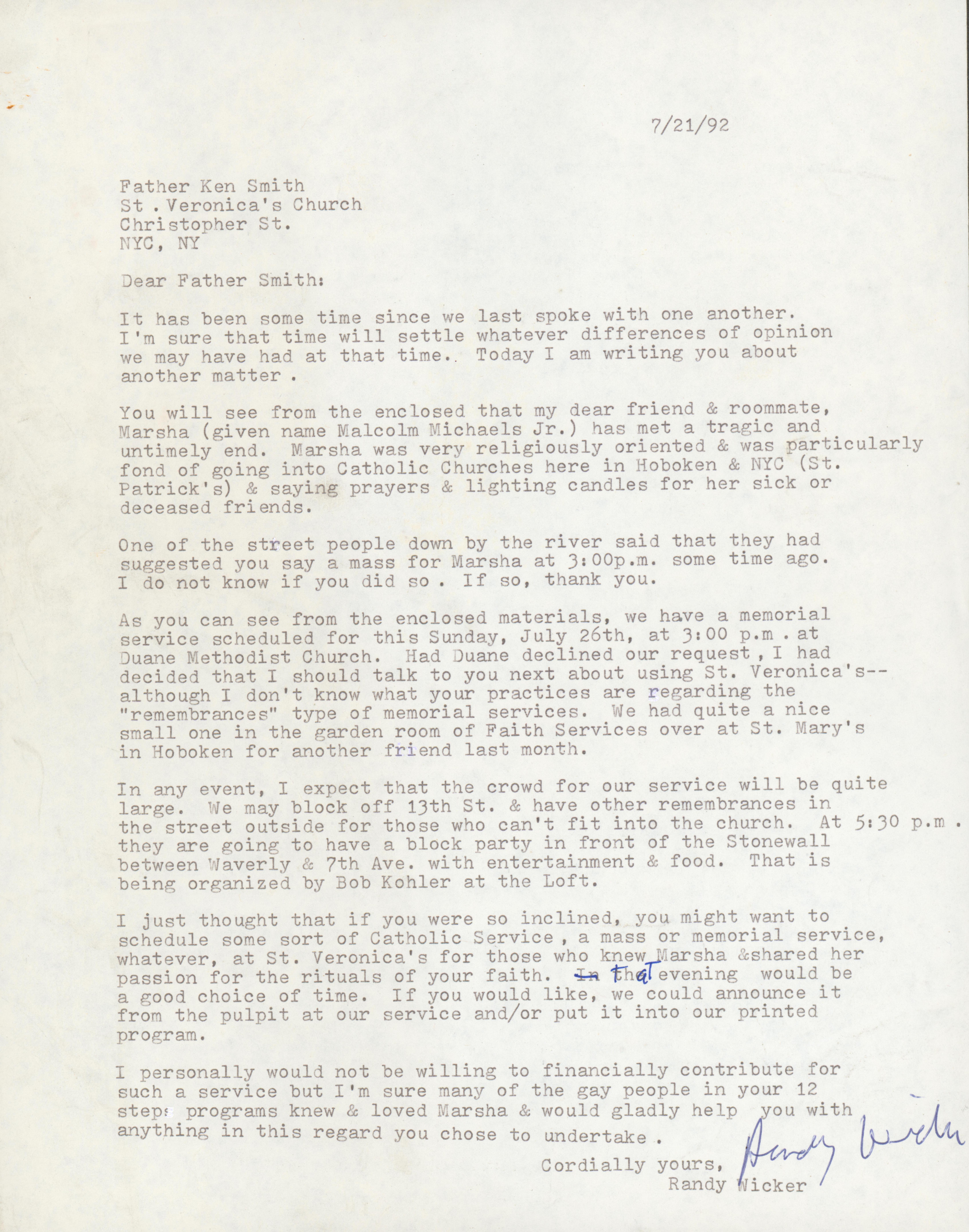 This item is a correspondence written by Marsha P. Johnson's roommate Randy Wicker to Father Ken Smith at St. Veronica's Church in New York City. Randy is writing to him to ask if he'd be interested in scheduling a Catholic memorial service for Marsha at his church.