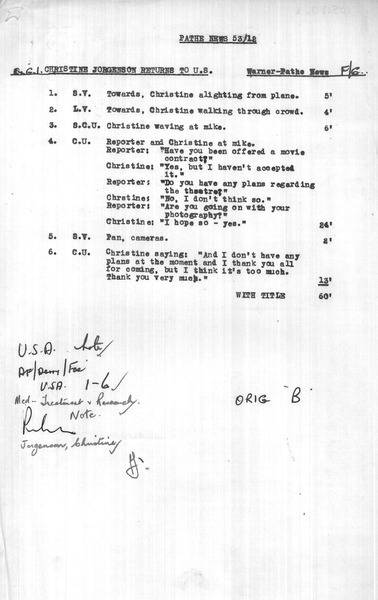 Soldier Christine Joregensen had a sex change in Denmark and returns home to the US. V. Towards, Christine Jorgensen alighting from 'plane. LV. Towards, Christine walking through crowd. SCU. Christine waving at mike. CU. Reporter and Christine at mike: Reporter: "Have you been offered a movie contract?" Christine: "Yes, but I haven't accepted it". Reporter: "Do your have any plans regarding the theatre" Christine: "No, I don't think so" Reporter: "Are you going on with your photography?" Christine: "I hope so - yes". SV. Pan, cameras. CU. Christine saying: "And I don't have any plans at the moment and I thank you all for coming, but I think it's too much. Thank you very much."