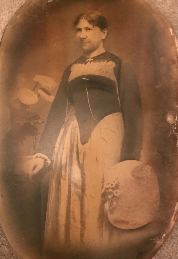 A photograph of a person (given the time likely a performer) posing in a photography studio wearing a dress.