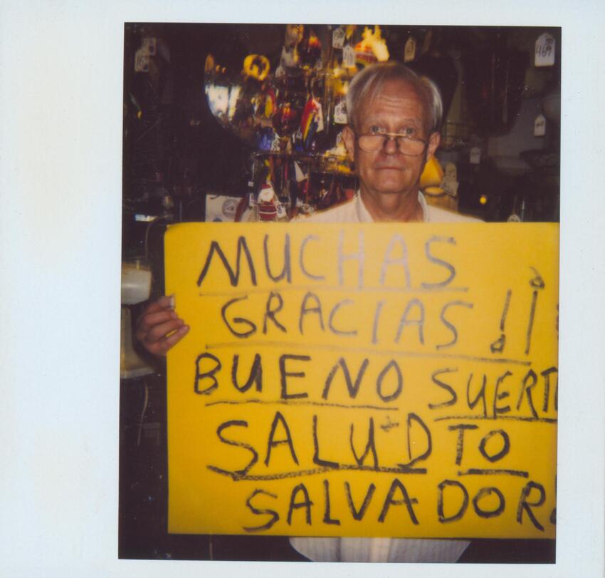 Photographs of Randy Wicker holding a yellow farewell sign for his friend, Melissa, who also helped at this store, Uplift Lighting. The sign reads "Muchas Gracias!! Bueno Suerte Salud to 'Salvador.'"