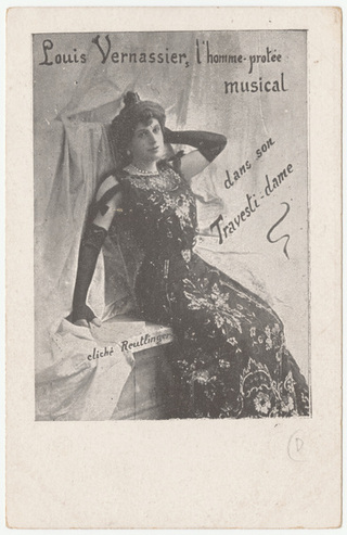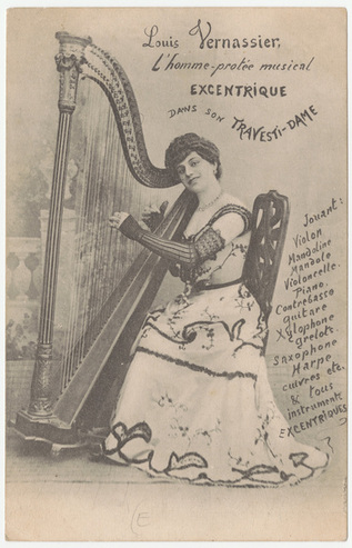 Montage of three portraits of Vernassier showing his transformation from middle-aged man to grand dame. Divided verso; notice printed full width indicating “Carte Postale / La Correspondance au recto n’est pas acceptée par tous les pays étrangers. (Se renseigner à la Poste)”