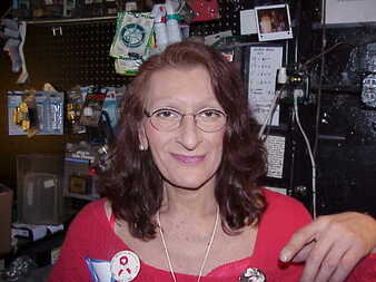 A photograph of Sylvia Rivera sitting and talking to another person at Uplift Lighting. She’s wearing a red shirt and glasses. There’s a table in front of her with cups and bottles on it, and behind her are the lamps from the store.