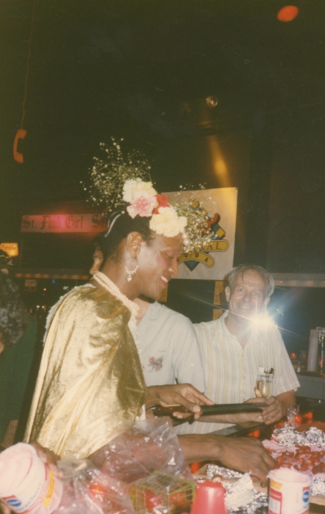 Photographs of Marsha P. Johnson cutting into her birthday cake at a bar. She’s wearing a floral and pearl headpiece, and white and gold sequined dress. Her roommate Randy Wicker stands next to her holding a drink.