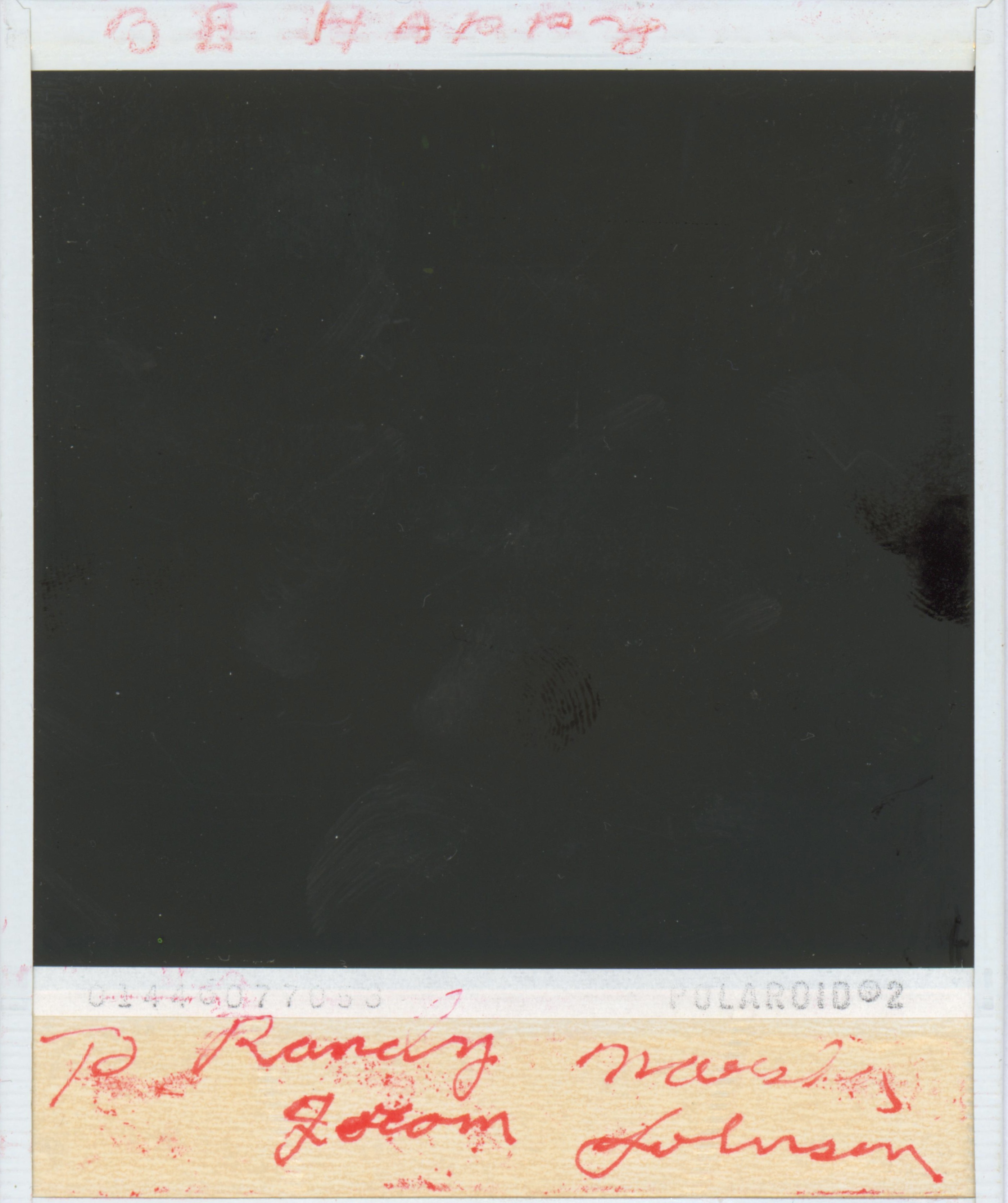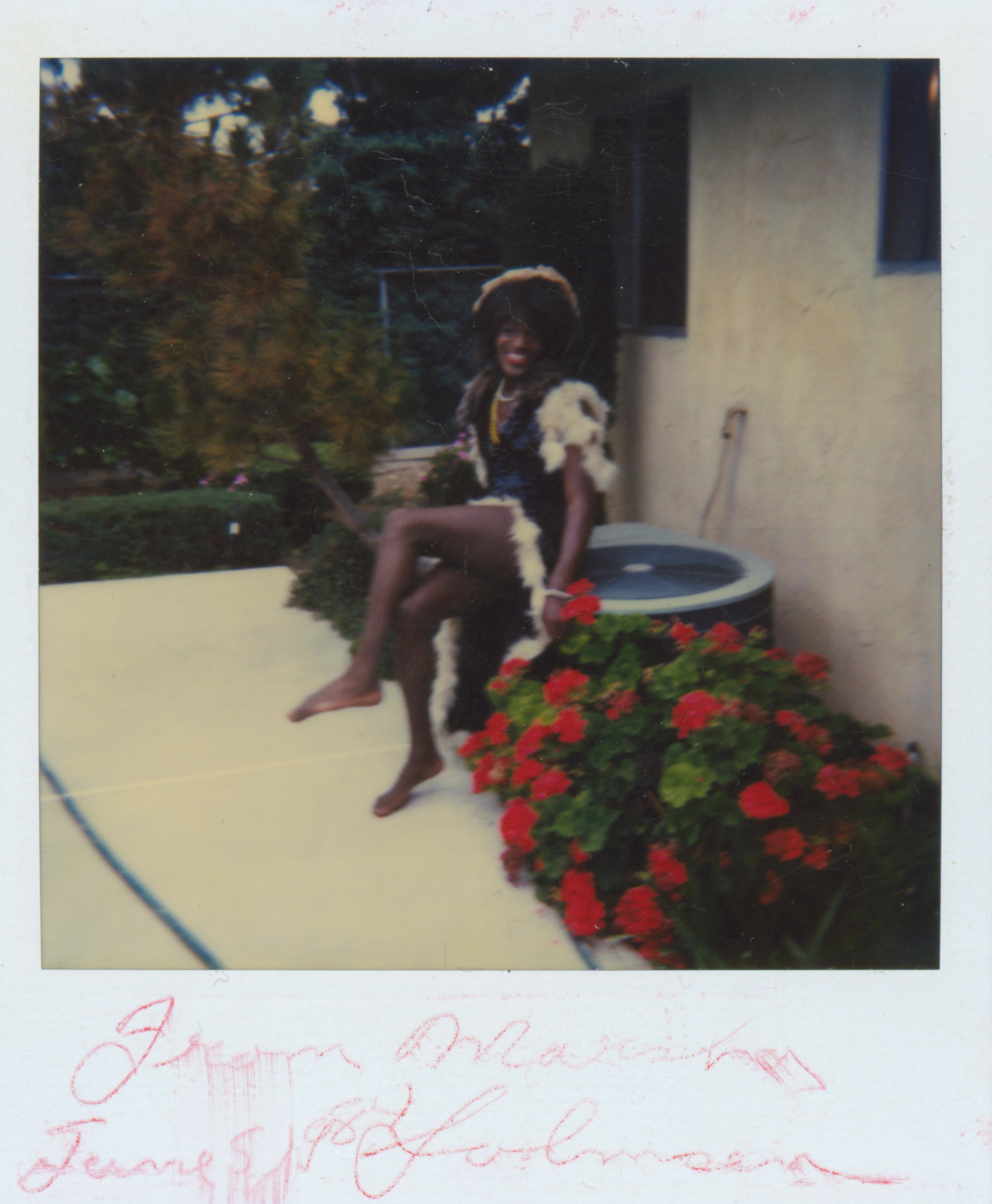 A Polaroid of Marsha P. Johnson posing on an outdoor AC unit next to a flower bush. She is wearing a black dress with white fur trimming. On the front, the Polaroid reads "From Marsha Johnson, June 5, 1984" and the back reads "Be Happy. To Randy, From Marsha Johnson."