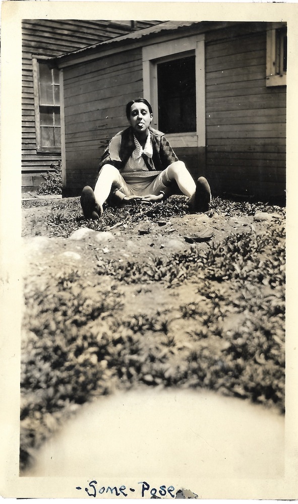 A photograph of Dorris Bullard taken while she was sitting on the ground. The image is captioned "Some Pose."
