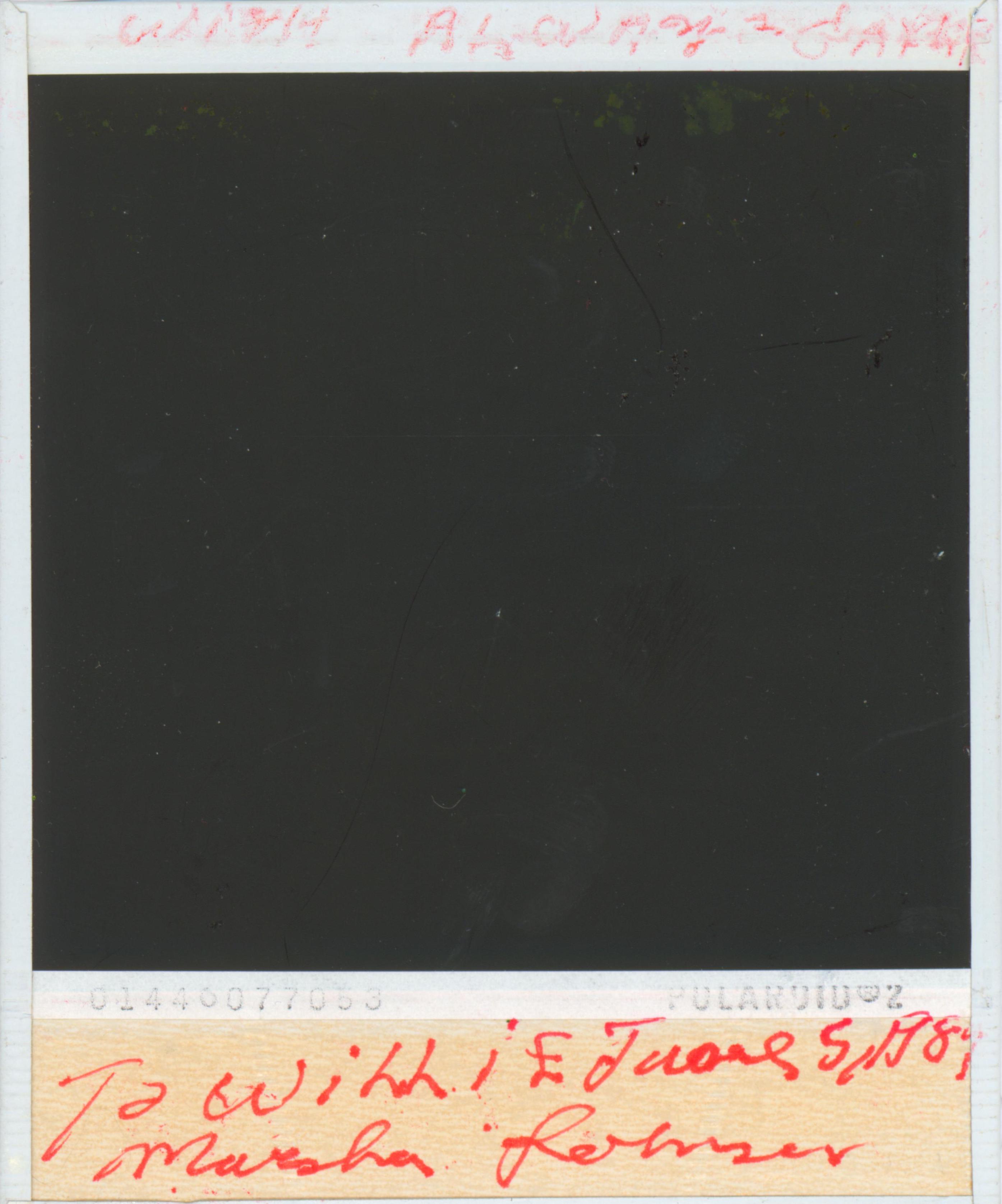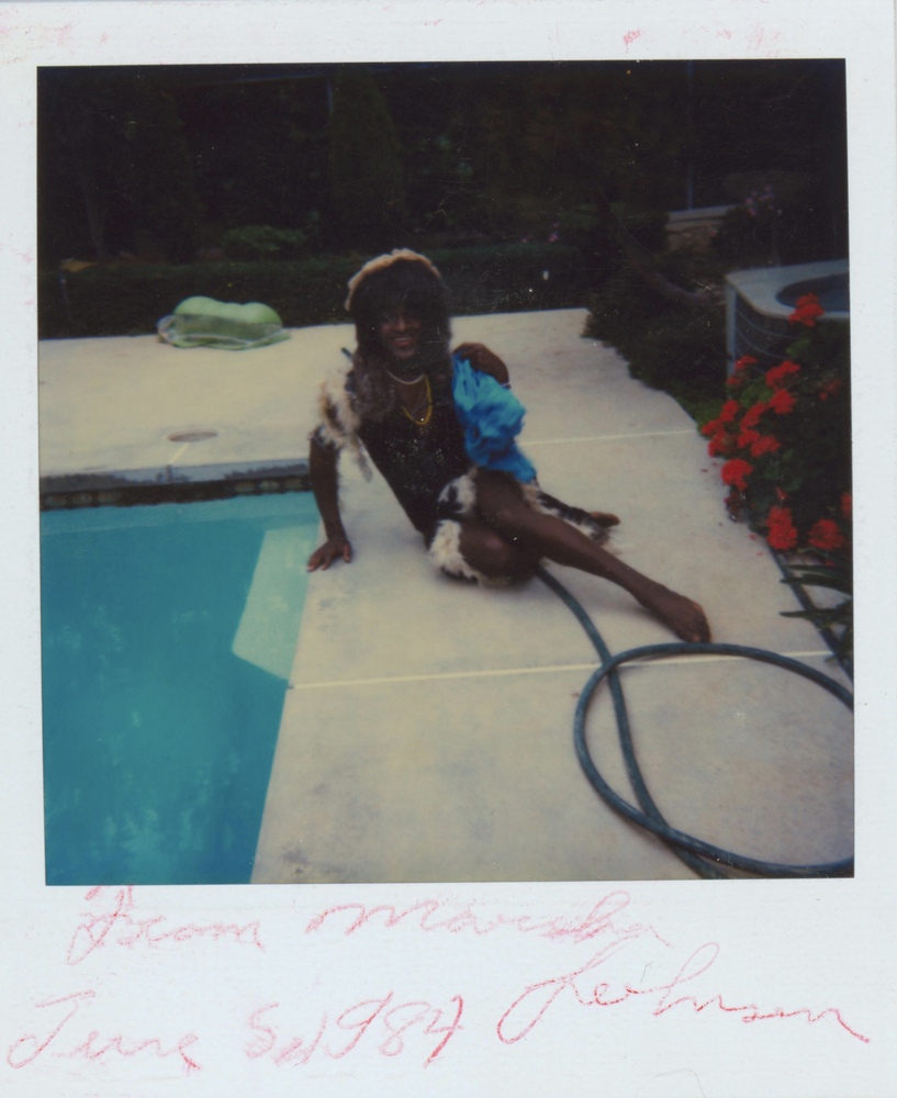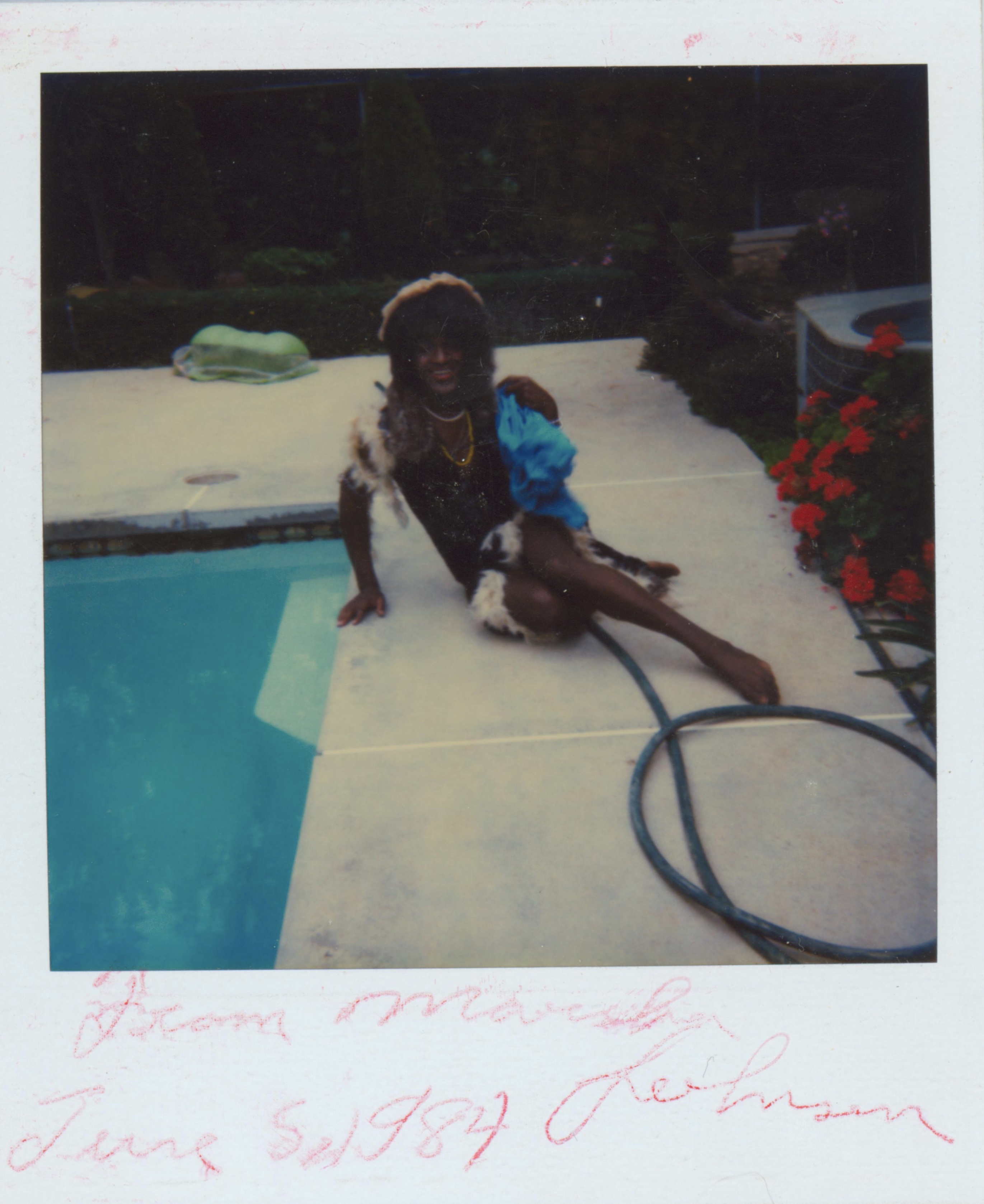 A Polaroid of Marsha P. Johnson sitting on the ground next to a pool, wearing a black dress with fur trimming. She’s holding a bunched up dress in her hand. There’s also a hose on the ground. On the front of the Polaroid, it reads "From Marsha Johnson, June 5, 1984." On the back it reads "To Willie, June 5, 1984, Marsha Johnson."