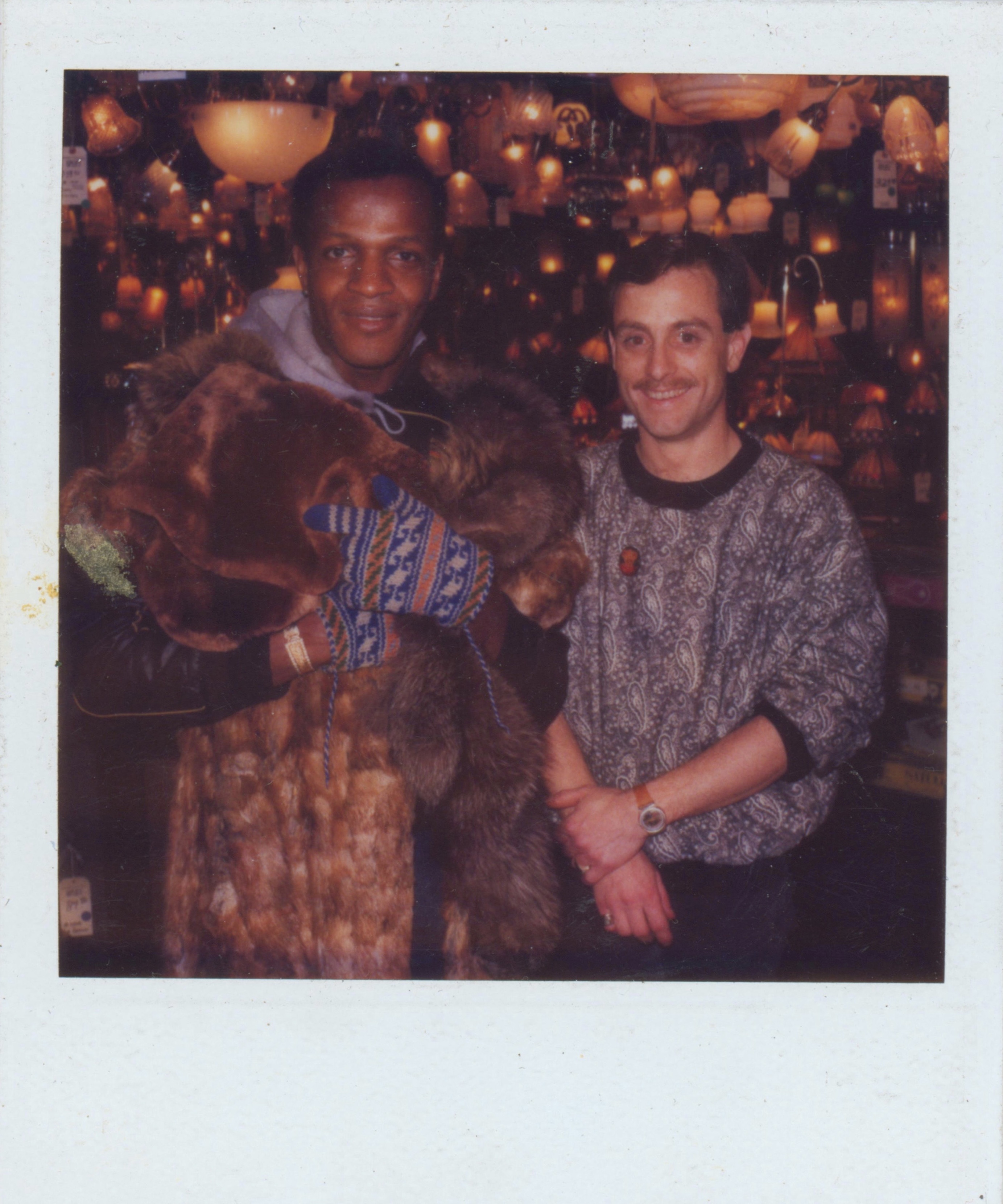 A Polaroid of Marsha P. Johnson wearing a fur coat and blue and orange patterned winter gloves. She's posing with another person wearing a gray patterned sweater at Randy Wicker's store Uplift Lighting.