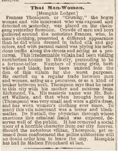 An article reproduced from the Memphis Ledger describing Frances Thompson's imprisonment and the circumstances leading to her arrest.