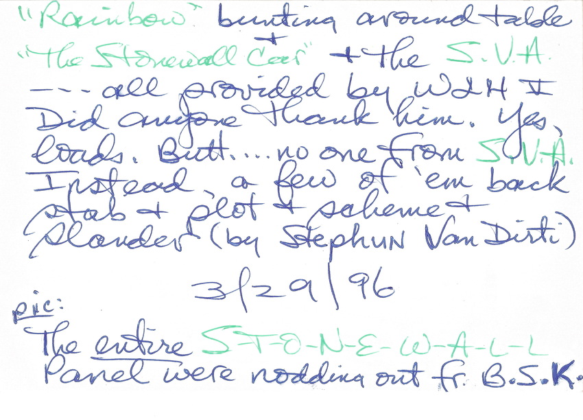 A Photograph of Stormé DeLarverie seated at the end of a long table covered in rainbow bunting. Two other panelists are seated while three stand behind the table.