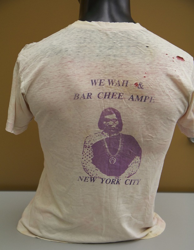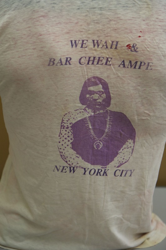 Off-white t-shirt. Printed on the front of the t-shirt in blue ink is a model of the globe with the word "HOME" surrounding it. Printed on the back of the t-shirt in lavender ink is a photograph of We'wha (a Zuni fiber artist and cultural ambassador from New Mexico) and the words "WE WAH & BAR CHEE AMPE NEW YORK CITY."