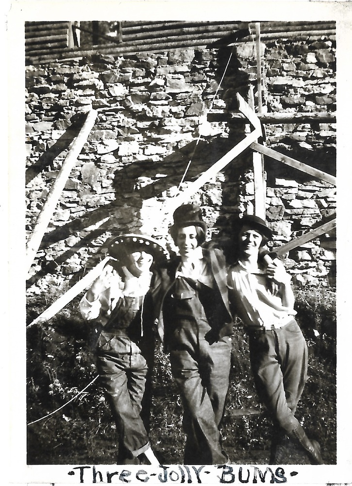 A photograph of Dorris Bullard and two other people posing in front of a brick wall. The image is captioned "Three-Jolly-Bums."