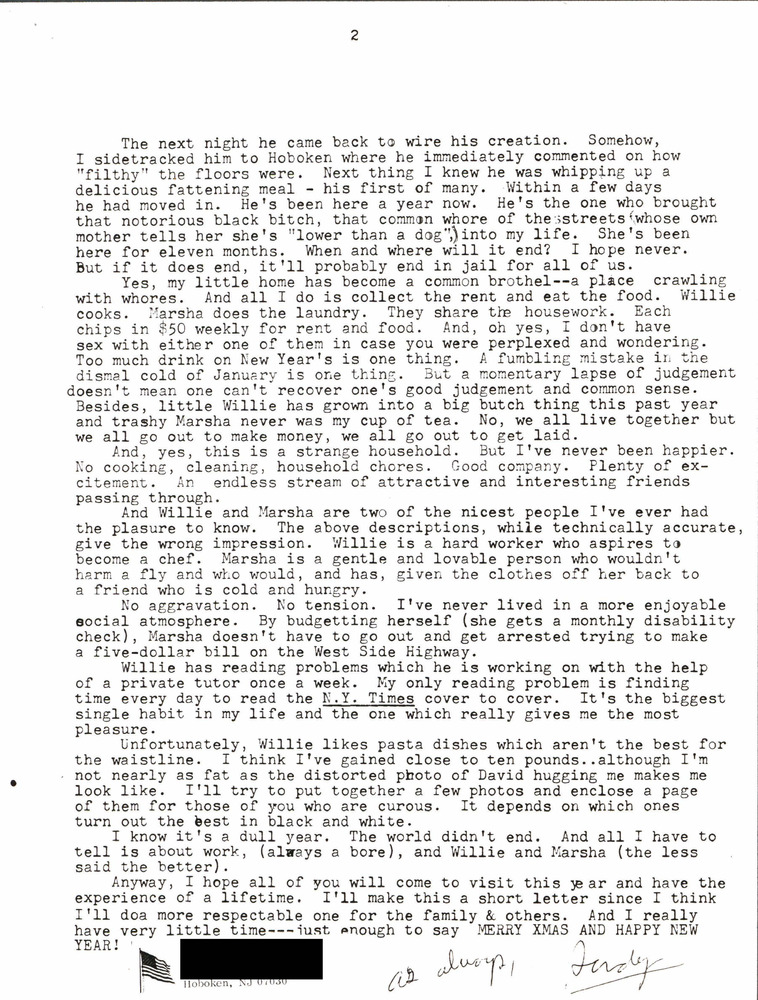 The 1982 issue of an annual newsletter written by Marsha P. Johnson's roommate, Randy Wicker, in which he provides updates on his life and business, the household, and close friends. The author describes meeting Marsha and how she came to live with him. He also discusses the relationships and division of household duties among the three housemates.