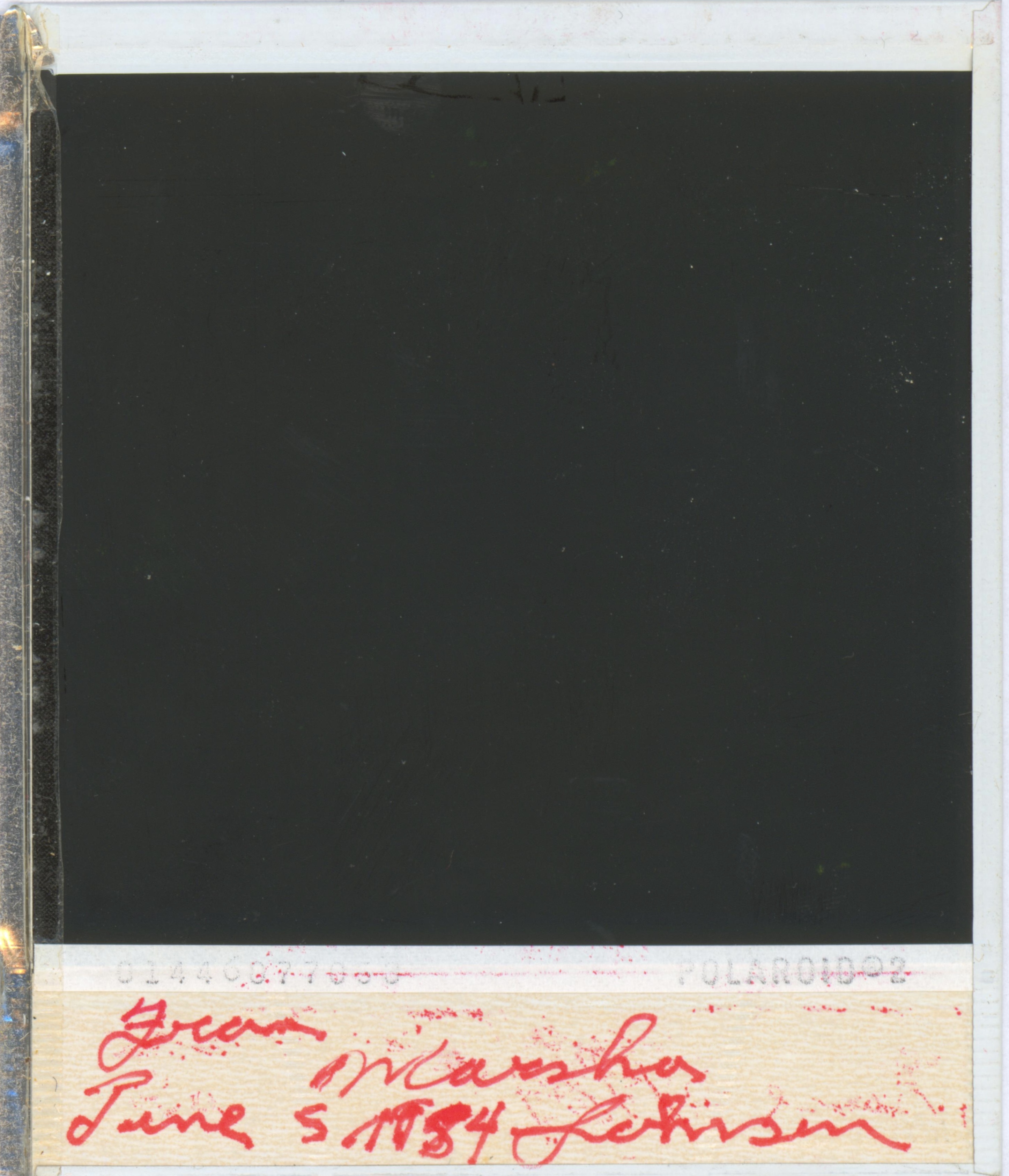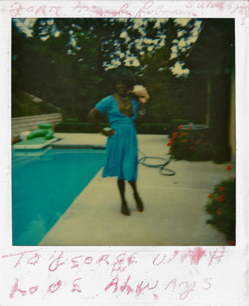 A Polaroid photograph of Marsha P. Johnson posing poolside in a blue dress. Marsha is holding a bouquet of flowers. There is faded red writing that reads, "Form [sic] Marsha P. Johnson, To George With Love Always."