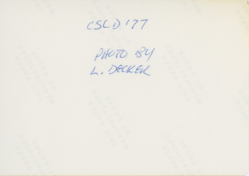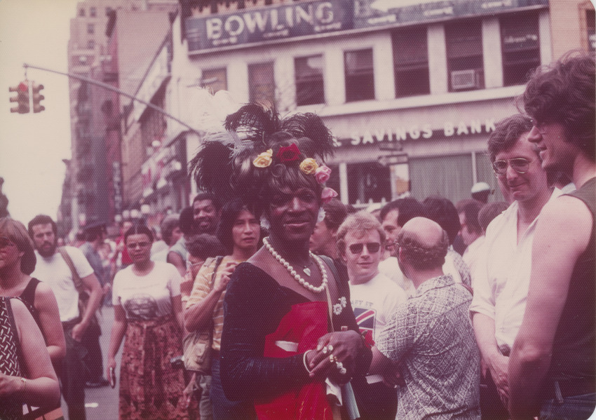 Photograph of Marsha. P Johnson at the 1977 Christopher Street Liberation Day Parade. Front and back included.