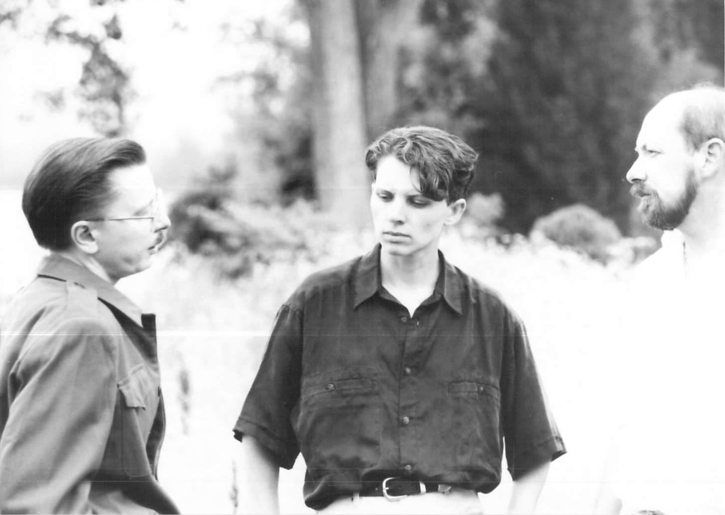 From left to right; Ben Power, Jacob, and Mikel-Jon Carter are photographed as Bet speaks to the others.
